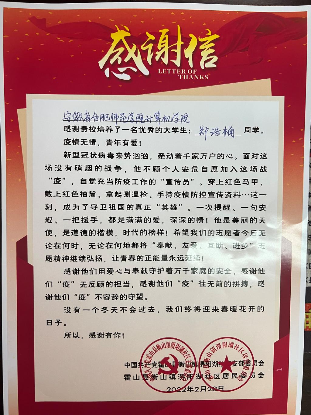 近日,我院收到六安市霍山县衡山镇淠阳湖社区发来的感谢信,高度赞扬我院2019级数据科学与大数据技术专业郑浩楠同学在寒假期间为淠阳湖社区疫情防控工作做出的积极贡献。
