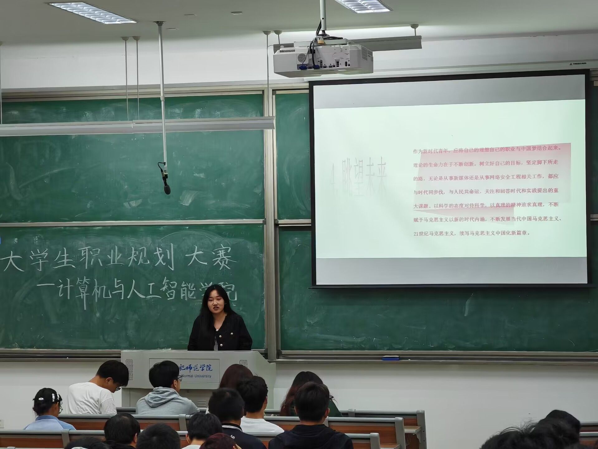 参赛选手们以演讲结合PPT展示的形式,从职业目标、行动成果、目标契合度、实行意向四个方面多方面、高角度阐述自己对未来职业的规划,向观众展示自己未来的愿景与实施计划。