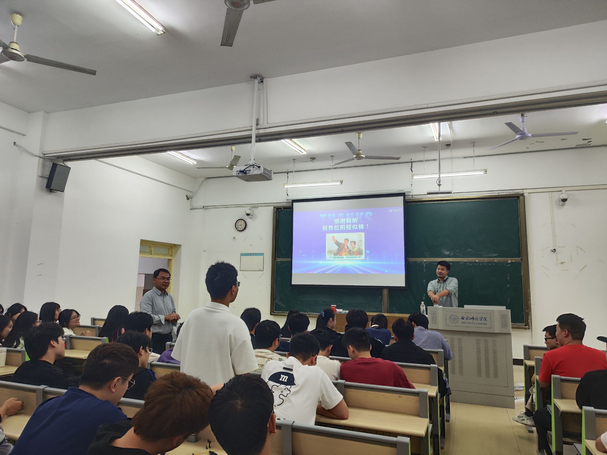 熊科以“致未来的IT工程师”为主题,从IT行业介绍、就业形势分析、企业基本情况、择业不同方向、签订就业协议等方面进行细致讲解,针对学生最关注的面试问题,结合具体的面试场景和案例进行现场解答,同学们就实习、择业、就业相关问题积极互动交流。谢飞对同学们提出殷切希望:要明确目标,勇于实践,持续学习,抓住秋招的黄金时期,积极主动投入就业市场。