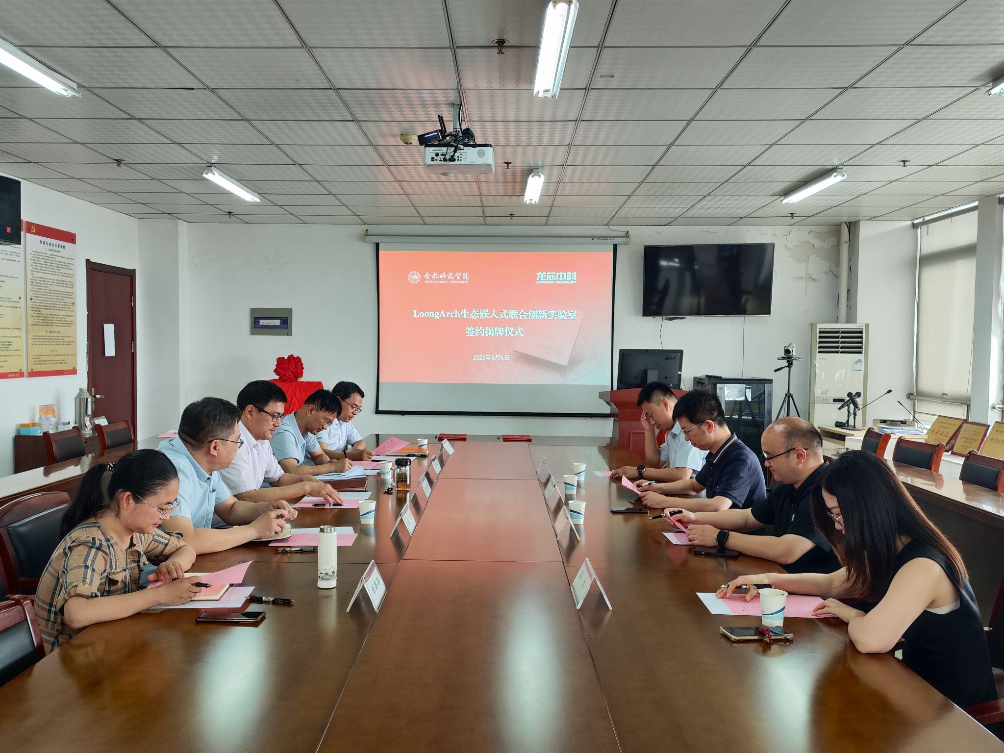 会上,校企双方签署了合作协议,周端明、彭飞为LoongArch生态嵌入式联合创新实验室揭牌,双方就深入合作相关细节进行了研讨和交流。