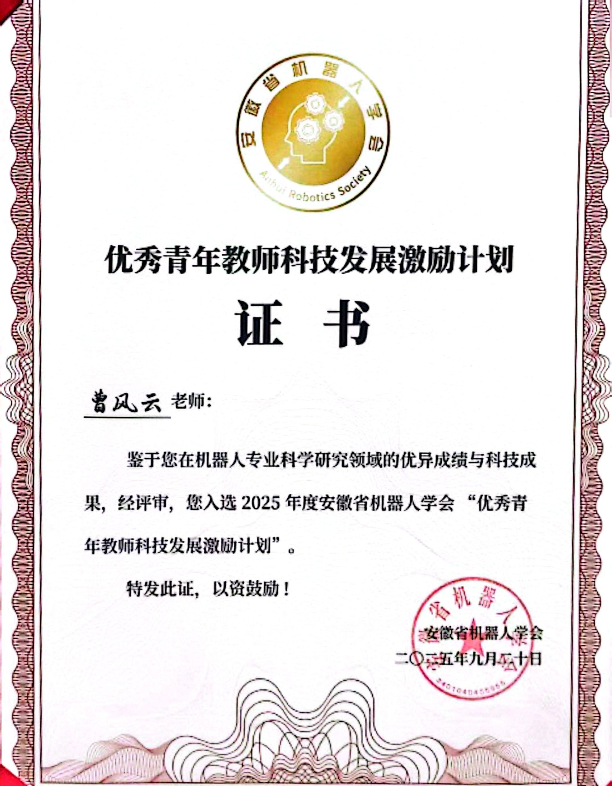 近日,第三届安徽省机器人大会暨智能机器人产业生态发展论坛在安徽工程大学召开,会上颁发了安徽省机器人学会2025年度奖励。365best体育亚洲官网曹风云老师荣获优秀青年教师发展激励计划奖励。