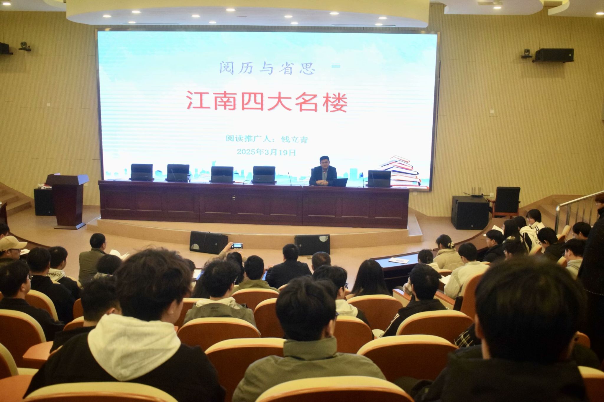 3月19日,“阅+历”读书讲堂“名家导读”系列讲座在滨湖校区多功能报告厅举办,江淮文化名家、安徽省十佳阅读推广人,教务处处长钱立青教授为同学们作了题为“阅历与省思:江南四大名楼”的讲座。365best体育亚洲官网学生代表150余人参加。滨湖校区综合管理办公室主任周荣,图书馆馆长方孝玲,美术与设计学院副院长吴道义,365best体育亚洲官网党委副书记杨萍出席。讲座由365best体育亚洲官网党委书记王祥主持。